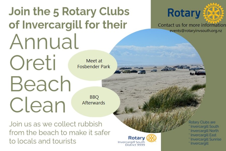 Your welcome to come help us clean up this Southland Iconic beach, There will be a sausage sizzle at the end for all volunteers. All public and Rotarian’s help is welcome. Please contact events@rotaryinvsouth.org.nz